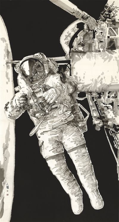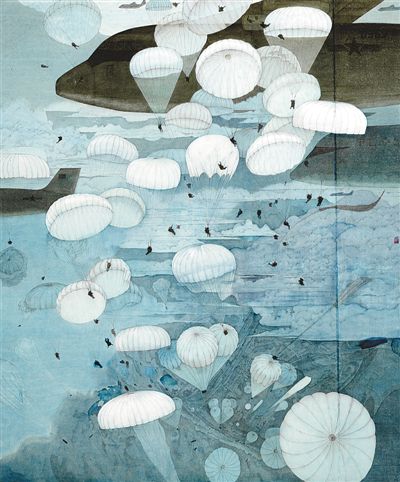 “一張一弛,文武之道也?!蹦纤我詠淼臏p筆水墨人物畫傳統(tǒng),經(jīng)過現(xiàn)代美術(shù)教育的訓(xùn)練,成為新中國現(xiàn)實(shí)主義軍事題材繪畫的主流畫法,現(xiàn)在則結(jié)合了更多破墨、焦墨、宿墨的手法,在表現(xiàn)殘酷、艱辛、勇猛的視覺體驗(yàn)時(shí)有了更加極致的運(yùn)用,富有激情,但其主流地位已不復(fù)從前。古代人物畫傳統(tǒng)中最常見的工筆畫,轉(zhuǎn)而成為中國式的新寫實(shí)主義中國畫主體,在表現(xiàn)和平年代軍事題材方面,如一縷清風(fēng),吹拂著熱愛和平、珍視生命的心靈。這類作品屢屢在全國、全軍美展中獲獎,反映了當(dāng)代軍事美術(shù)不同于戰(zhàn)爭年代的一個維度。在今年的慶祝建軍90周年美展中,可以看到,不僅這兩種基本畫風(fēng)越來越成熟,而且得益于當(dāng)代藝術(shù)理念的借入,航天部隊(duì)、航空母艦等新題材、新視野的引進(jìn),以及年畫、剪紙等傳統(tǒng)民間美術(shù)形式的汲取,甚至傳統(tǒng)界畫手法的運(yùn)用,參展作品展現(xiàn)出更加豐富、更加多元的面貌,充分體現(xiàn)出近年來軍事題材美術(shù)創(chuàng)作的新氣象。與此同時(shí),一些借鑒了現(xiàn)代藝術(shù)中超寫實(shí)主義的理念,以及印象主義的手法,以傳統(tǒng)中國畫技法經(jīng)銳意創(chuàng)新而成的一類新作品,引領(lǐng)出了一種集現(xiàn)實(shí)主義形態(tài)、當(dāng)代藝術(shù)理念、中國傳統(tǒng)技法于一身的超現(xiàn)實(shí)中國畫,在近年來的軍事題材繪畫中嶄露頭角。他們的藝術(shù)創(chuàng)新,對于我們研究和思考當(dāng)代軍事美術(shù)如何傳承與發(fā)展,具有重要的價(jià)值。