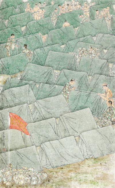 當(dāng)然,怎樣從這些多種多樣的古代繪畫資源中汲取營養(yǎng)、借鑒轉(zhuǎn)化,有效促進(jìn)當(dāng)代軍事題材美術(shù)創(chuàng)作,并不是一件容易的事情。近年來,隨著軍事文化的提升,也得益于時(shí)代資訊的發(fā)展,中國的軍事美術(shù)教育、軍事題材美術(shù)創(chuàng)作,在傳承、轉(zhuǎn)化與弘揚(yáng)民族藝術(shù)的道路上,不斷推進(jìn)和深化??v觀兩千年中國繪畫史,由于中國畫工具材料的特殊性,藝術(shù)語言的拓展和創(chuàng)新,往往肇始于新題材的挑戰(zhàn)。從這個角度來觀察和思考,現(xiàn)當(dāng)代軍事題材美術(shù)創(chuàng)作有十分廣闊的藝術(shù)空間。新中國的幾代前輩畫家,在軍事題材繪畫藝術(shù)的探索上,做出了卓越的貢獻(xiàn)。新時(shí)期以來,隨著新軍事變革的推進(jìn),依托軍事美術(shù)教育的搖籃和廣泛深入基層的有組織的軍旅美術(shù)創(chuàng)作,更多的中青年軍隊(duì)畫家成長起來,在藝術(shù)理念、繪畫題材、繪畫手法等多方面,勇于嘗試,逐步開拓出一片新天地,并在最近的幾屆全軍美展中有所呈現(xiàn)。