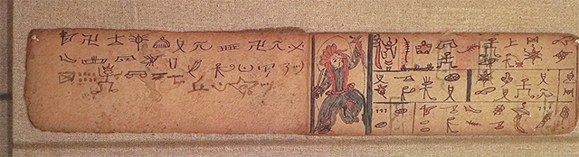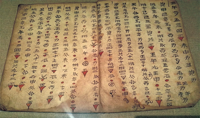東巴文《東巴舞譜》,為納西族古老的宗教?hào)|巴教記錄和傳授跳神舞蹈的儀式程序、內(nèi)容、跳法的一種經(jīng)典。共記錄了34種東巴舞蹈。