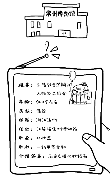 小女子來(lái)自江蘇省的常州博物館,是用漆樹(shù)的汁液涂在器物的表面制成的器物,身份證上名叫“南宋朱漆戧(音“嗆”)金蓮瓣式人物花卉紋奩”。這么復(fù)雜的名字是文物專家們?yōu)榱藴?zhǔn)確描述我的特征而取的全名。起這種又長(zhǎng)又難讀的名字,上課老師提問(wèn)一定不會(huì)點(diǎn)到我吧?