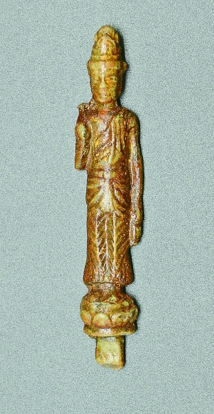 何金龍說,這次出土的文物主要出土于三號發(fā)掘區(qū)內,有漢晉時期紋飾殘墓磚2塊、南詔有字殘瓦338片、南詔殘花紋磚7塊、殘方磚21塊、殘綠釉磚2塊、殘?zhí)狰|吻10件、殘紅砂石佛首1件、完整青銅鎏金楊枝觀音立像1件、青銅金剛杵1件、殘綠釉陶瓶2件、殘綠釉陶碗1件、殘黃釉陶盞1件、殘灰陶盞1件、貼金箔夾砂陶片4小塊、開元通寶2件、殘滴水16件、殘瓦當24件等。