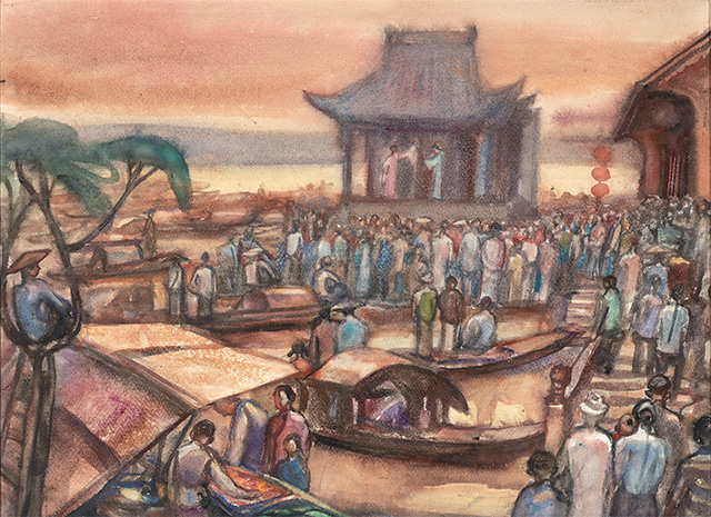 圖為莊弘醒水彩畫作品《社戲》
