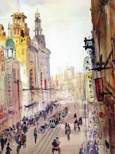 哈定經(jīng)典水彩畫《繁忙的南京路》。(展方供圖)