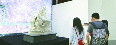 觀眾在現(xiàn)場(chǎng)參觀米開朗基羅雕塑復(fù)刻作品。圖片為本報(bào)記者 于園媛攝/光明圖片