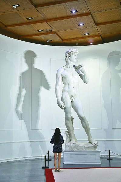 觀眾在現(xiàn)場(chǎng)參觀《大衛(wèi)》雕塑復(fù)刻作品。圖片為本報(bào)記者 于園媛攝/光明圖片