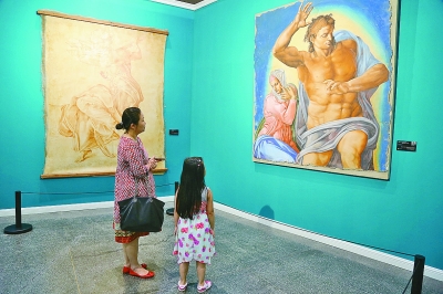 8月20日,正在鳥巢文化中心展覽的“米開朗基羅國(guó)際藝術(shù)展”展廳里,人們?cè)陟o靜觀賞。被譽(yù)為“文藝復(fù)興三杰”之一的大師有著不言自明的號(hào)召力,吸引來不少觀眾,有三五成群的年輕人、結(jié)伴而來的情侶,也有帶著孩子的父母。