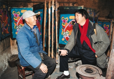 馮驥才(右)在普查中發(fā)現(xiàn)了天津楊柳青鎮(zhèn)南宮莊子唯一活態(tài)的“粗活”年畫藝人王學(xué)勤(左)。