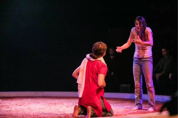于是,我們在這版《安提戈涅》里,看見了一場沙子與血的盛宴,權(quán)利與人性的較量。導演將斗牛士與公牛之間的對決,和安提戈涅與國王、與權(quán)威之間的抗爭做比擬。紅色的沙子象征著鮮血、生命、死亡。在這樣的舞臺中,安提戈涅的斗爭與死亡更顯悲情。她已用盡全力去進攻,依舊像公牛倒在斗牛士面前一樣,無法扭轉(zhuǎn)自己的命運。而且,在發(fā)現(xiàn)內(nèi)心的正義世界與殘酷現(xiàn)實體系相距甚遠的時候,她渴求死。