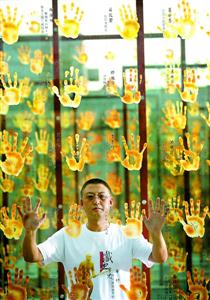 圖為樊建川在老兵手印廣場。這個廣場是他征集了4000多枚抗戰(zhàn)老兵手印建成的。他說,正是這些當年揮舞大刀長矛、擲手榴彈、埋地雷的手,擋住了來勢洶洶的日本侵略軍,力挽狂瀾,這些功勛卓著的手應該留下來。