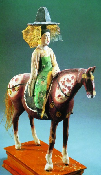 不過(guò)也有不同說(shuō)法。1972年陜西禮泉唐張士貴墓出土了一批陶俑。張士貴葬于唐高宗顯慶二年(657),此時(shí)帷帽正流行,因此“彩釉笠帽女騎馬俑”(圖③)的所戴,可能也與帷帽有些關(guān)系,因?yàn)槠湫沃婆c《舊唐書·輿服志》中所說(shuō)帷帽特點(diǎn)的“拖裙到頸”最為契合。