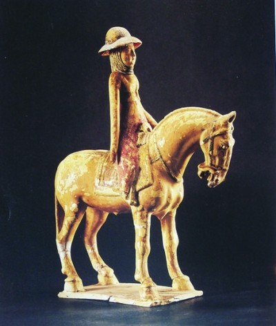 至于唐玄宗以后女性“露髻”騎馬的文物就很多了,例如陜西西安西郊唐墓出土玄宗開元時(shí)代“馳馬女俑”(圖④)中的女性不僅“露髻”,而且連靴子都脫了掛在馬鞍上,真是無(wú)拘無(wú)束??!