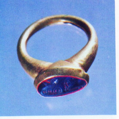 出土文物也能說(shuō)明此點(diǎn)。在已經(jīng)發(fā)掘的數(shù)百座唐墓中,指環(huán)寥寥無(wú)幾。僅有的幾枚似乎也均與外族相關(guān)。例如1983年在河南偃師杏園村盛唐墓中出土的一件金指環(huán),最大外徑2.2厘米,上嵌橢圓形紫色水晶,水晶上淺刻中古時(shí)期的巴列維語(yǔ)(圖⑤)。這件金指環(huán)顯然來(lái)自域外,且出土?xí)r握在墓主人的右手中。凡此種種,均可說(shuō)明唐代女性的手指上一般是并不佩戴指環(huán)的。