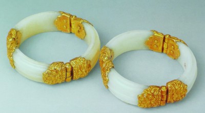 那么唐代女性的手飾主要是什么?主要是臂環(huán)、臂釧,其實(shí)就是手鐲。臂環(huán)是傳統(tǒng)的女性手飾,中外均有,在唐朝使用非常普遍。傳世周昉畫《簪花仕女圖》中的仕女,有些就戴著臂環(huán)。唐代筆記《明皇雜錄》專記唐玄宗事,其中說(shuō)楊貴妃曾送給女伶謝阿蠻一個(gè)“金粟裝臂環(huán)”,楊貴妃死后,阿蠻將臂環(huán)獻(xiàn)給玄宗,引起玄宗思念,“持之出涕”,哭的不能自已。臂環(huán)在出土文物中常見,比較精美且有明確文字說(shuō)明的是1970年陜西西安何家村唐代窖藏中出土的“玉臂環(huán)”(圖⑥)。玉臂環(huán)內(nèi)徑6.6厘米,與現(xiàn)代一般手鐲的內(nèi)徑相仿,但制作精美,有合頁(yè)可以開合,便于佩戴。由于裝盛臂環(huán)的銀罐上明確寫有“玉臂環(huán)四”字樣,因此知道此手飾在當(dāng)時(shí)被稱為“臂環(huán)”。