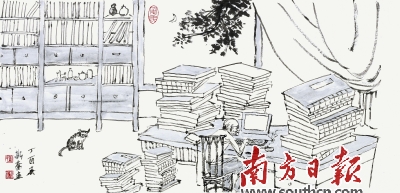 除劉逸生的個(gè)人創(chuàng)作外,門(mén)生故交撰寫(xiě)的紀(jì)念作品、學(xué)術(shù)、詩(shī)詞、書(shū)畫(huà)界的紀(jì)念書(shū)畫(huà)亦同場(chǎng)展出。長(zhǎng)子劉斯奮所繪的《蝸緣居感舊圖》手卷,是此次紀(jì)念活動(dòng)的點(diǎn)睛之筆:畫(huà)中一位耄耋老者正在堆滿“大部頭”的電腦桌前埋首,奮力敲打鍵盤(pán)。手卷還收錄10多位親朋故舊的題跋,長(zhǎng)達(dá)10余米,蔚為大觀。