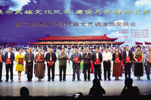 8月28日,本屆文藝調(diào)演頒獎(jiǎng)晚會在寧夏大劇院舉行,白尚成、王儒貴、馬力、安純?nèi)说茸灾螀^(qū)領(lǐng)導(dǎo)出席了頒獎(jiǎng)晚會并為獲獎(jiǎng)節(jié)目頒獎(jiǎng),自治區(qū)黨委宣傳部、統(tǒng)戰(zhàn)部、民委、文化廳等部門和參演單位的負(fù)責(zé)同志與各族群眾一起觀看了演出。