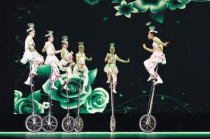 雜技《高車踢碗》展現(xiàn)了演員高超的平衡、踢碗等技藝。