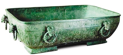 原始初民的浴具以實用為主,但也不乏審美元素,各類浴具上往往刻有各類幾何紋,直線、曲線、水紋、三角紋、漩渦紋、鋸齒紋等等?,F(xiàn)存最古老的浴器“虢季子白盤”,青銅質(zhì)地,盤口呈圓角長方形,曲尺形足,飾有波曲紋,沉雄厚實,線條雄健。春秋到兩漢時期的浴具,無用之用的美學功能更加凸顯。如吳王夫差鑒,兩側(cè)口沿旁刻有兩只小龍,前足在口沿,后足蹬著器壁,作探頭狀,如同窺浴,神氣活現(xiàn),生動活潑,充滿了生活情趣。還有一些浴具如陶杅、沐盤等往往飾以貝紋、蟠螭紋、夔紋等紋飾,裝飾繁復(fù)華麗,姿態(tài)萬千,簡直就是觀賞藝術(shù)品。