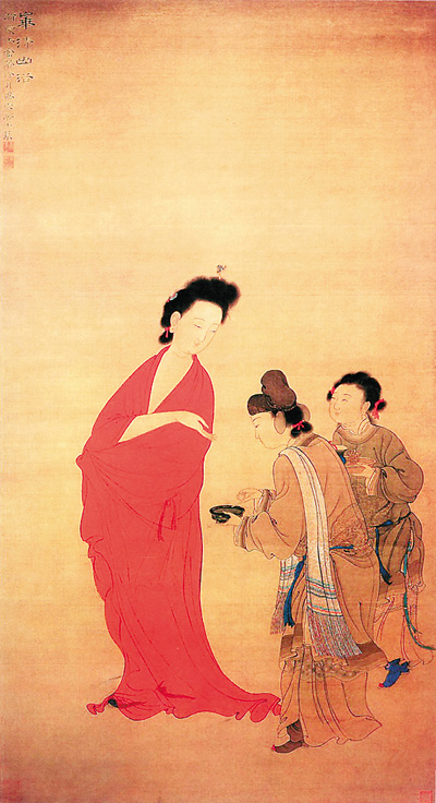 “貴妃出浴”在詩詞中也數(shù)不勝數(shù)?!按汉n浴華清池,溫泉水滑洗凝脂。侍兒扶起嬌無力,始是新承恩澤時?!保ò拙右住堕L恨歌》)“簾影罷添新翡翠,露華猶濕舊珠璣。”(徐夤《華清宮》)“百媚千嬌出浴時,君王凝盼轉(zhuǎn)魂迷?!保ㄖ芏顺肌额}真妃出浴圖》)“溫泉暖滑留余香,芙蓉出水紅生光?!保ㄒγ恪额}楊妃出浴圖》)“出浴太真冰作影,捧心西子玉為魂。”(曹雪芹《紅樓夢》)……這些都是膾炙人口的佳句?!百F妃出浴”從唐經(jīng)由宋后,從對人體美的贊譽一躍成為“至美”的代名詞。如明代戲劇家朱權(quán)贊王實甫《西廂記》時說:“王實甫之詞如花間美人,鋪敘委婉,深得騷人之趣。極有佳句,若玉環(huán)之出浴華清,綠珠之采蓮洛蒲?!保ā短驼糇V》)正是用“貴妃出浴”來喻指文章之妙,得句之佳。