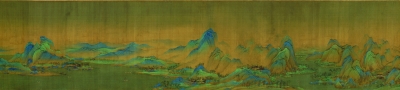 從全卷的構思構圖來看,王希孟是一個善于接受樂理的畫家,指授他作畫的宋徽宗就通曉樂理并能操琴奏樂,這些均十分自然地融匯到他的創(chuàng)作中。整幅圖卷就像一首波瀾壯闊的古典樂曲,形成了亢奮而優(yōu)雅的旋律,節(jié)奏感十分鮮明。全圖由七組群山組成,因而可以分成七個自然段,仿佛就是七個樂章。