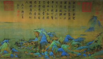 徽宗“誨諭”王希孟畫《千里江山圖》卷,是為了提振青綠山水、特別是要開創(chuàng)大青綠山水的繪畫語言。王希孟除了在畫學受到過基本訓練之外,幾乎是一張白紙,極易領會并實現(xiàn)徽宗的意圖。當時的李唐、朱銳等人的手法已經(jīng)定型,重塑的難度比較大。王希孟敢于大量使用石青石綠,這在以往是極為少見的,相信這是他的觀山所得:蒼翠蔥郁之山,近則呈綠,遠則顯青,原因是空氣的厚度改變了遠處山林的本色。畫家繼承前人用色之法,概括提煉出青綠二色。