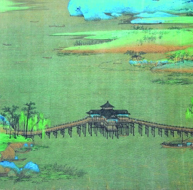 高聳的山峰和鮮亮的青綠色彩,是小提琴不斷演奏出的主旋律,豐滿厚實;緩坡、沼澤、流水恰似豎琴撥出的慢板,舒緩悠揚;高掛的瀑布和巉巖懸崖就像低音鼓敲擊出的節(jié)奏,鏗鏘深沉;建筑、舟船和人物活動如同長笛吹響的快板,輕盈跳躍。畫中的各組群山不是簡單地循環(huán)往復,而是有許多變化,如變換山體造型、增換瀑布和溪流以及建筑群等,細節(jié)變化則更多、更豐富,如同樂曲中的“變奏”。不同的節(jié)奏與情緒,在不斷地交織、變化中融合,一起奏響了北宋宮廷文化的燦爛之聲。