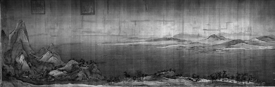 畫中一座座突兀的高山大嶺佇立在大江大湖邊,山勢雄秀,群峰簇擁主峰,據考證,類似這樣的地質地貌,極可能是贛北鄱陽湖與廬山。全圖系傳統(tǒng)的散點透視,群山均非概念化的排列,經過總體把握和周密布局,由七大組群山組成,像是某個具體地域的山勢作橫向展開,重現(xiàn)七次,每組都將主峰和諸多輔峰組合起來,如同一座座山島矗立在江邊湖畔,形成互有聯(lián)系的“島鏈”。這種觀察、組合群山的方式與畫家在江南的生活體驗有關。卷首第一組為序曲,該組和第二組之間以小橋相接,第三組和第四組之間以長橋相連,最高的主峰似廬山漢陽峰在第五組,拔地而起,成全卷的高潮。最后一組如同音樂的尾聲,節(jié)奏感十分鮮明。每一組群山不是作簡單循環(huán),都出現(xiàn)了許多新的變化,如變換山體造型、增換瀑布和溪流以及建筑群,如同樂曲中的“變奏”。