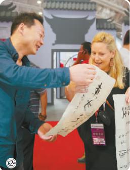 ②第十二屆北京文博會(huì)上,一名斯洛文尼亞觀眾被中國(guó)書(shū)法吸引。光明圖片/視覺(jué)中國(guó)