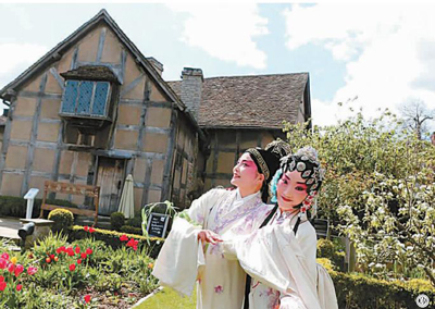 ③為紀(jì)念湯顯祖和莎士比亞逝世400周年,來(lái)自湯顯祖的故鄉(xiāng)中國(guó)江西撫州的演員在英國(guó)莎士比亞故居花園表演戲曲。新華社發(fā)