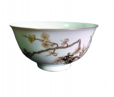 琺瑯彩瓷器中的山水樓閣是常見的表現(xiàn)手法,傳世稀少,十分珍貴。雍正琺瑯彩墨彩山水樓閣人物碗是很有代表性的一件。所謂墨彩,是在白地上繪黑彩。通常以黑地繪五彩或三彩的叫黑彩,墨彩所呈現(xiàn)的簡約、單純、嫻靜使這種瓷器達到應(yīng)得的效果。