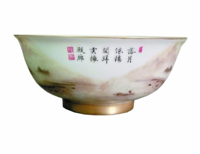 這件墨彩碗繪制了重臺秋樹,以黑彩為主要顏色,而只在樓臺楹柱、人物衣著上加染紅色,畫面樓閣描繪工細,樹木散發(fā)著秋天氣息,石頭也富有姿態(tài),三三兩兩的人物雖然看不清臉部細節(jié),但仍神態(tài)畢現(xiàn)。有江中打魚的,有獨自遠眺的,也有幾個人一起交談的,使畫面靜中寓動,富于生機。碗的一側(cè)題著詩句:“落月依樓閣,歸云擁殿廊”,詩句出自五代詩人徐鉉詩《宿山寺》,起首閑章“壽古”,尾章“高山”“流水”。碗的口沿和圈足加金,底部有“雍正年制”雙圈料款,胎體奇薄而結(jié)實,為雍正官窯瓷器難得精品。