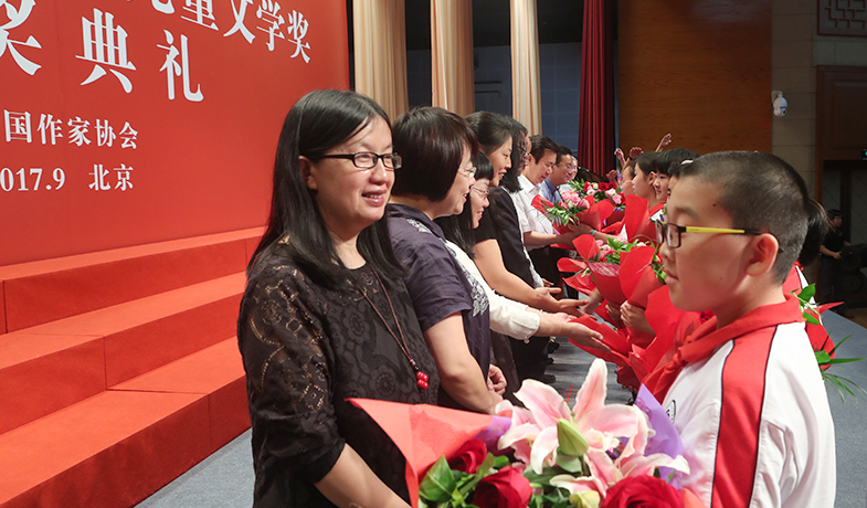 171中學(xué)學(xué)生上臺(tái)為每位獲獎(jiǎng)作家獻(xiàn)花