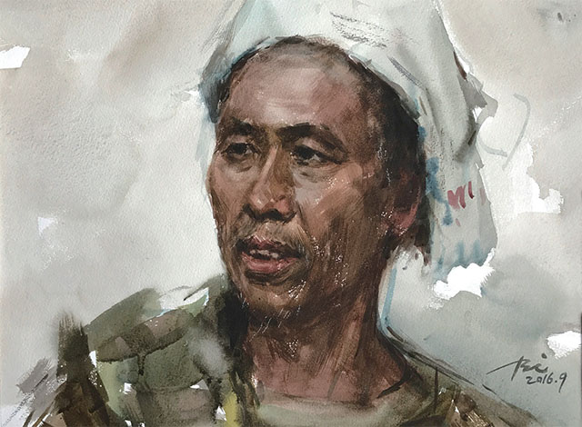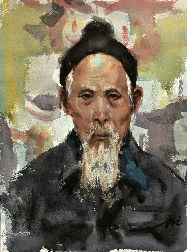 賀安成現(xiàn)已七十有七,但藝術(shù)創(chuàng)作的精力熱情不減,最近見到他在張家界10天畫的一批水彩人物寫生,將他家鄉(xiāng)的父老鄉(xiāng)親個個畫得形神兼?zhèn)洌坏蜗罂坍嬘稳杏杏?,行筆賦色也更為灑脫洗練。他以前畫得好,多得觀眾喜愛,專家亦早有佳評,但他年逾古稀功力不減當(dāng)年,藝術(shù)風(fēng)采依舊,更令我贊嘆不已。思來想去只能利用一句俗詞“寶刀未老”,來做小文標(biāo)題,并順祝他藝術(shù)之樹常青。