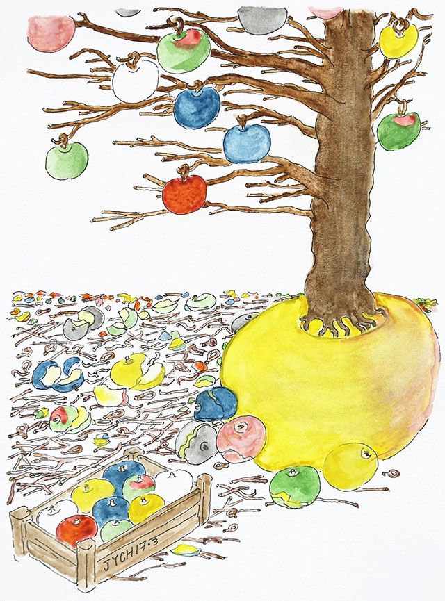 四周悄然無聲,蘋果樹亭亭玉立,儼然一桿寶幡,綠森森地蔭著人們。 (出自《方島·譬喻》)