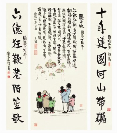 前不久滬上舉行的一次拍賣會(huì)上,豐子愷書(shū)畫(huà)作品 《慶千秋》 和 《行書(shū)八言》 聯(lián)袂亮相,喚起人們很多溫暖記憶。繪畫(huà) 《慶千秋》,寥寥數(shù)筆描繪出大人孩子觀賞煙花時(shí)其樂(lè)融融的場(chǎng)景。這是豐子愷在新中國(guó)成立以后的代表作,隨畫(huà)面溢出的不僅是溫暖和幸福,還有無(wú)限的希望。人們不難感受到,他的漫筆抒情畫(huà)隨新時(shí)代而得到重生。當(dāng)時(shí),豐子愷已舉家遷入上海陜西南路39弄93號(hào)的“日月樓”,安居樂(lè)業(yè),闔家幸福,躊躇滿志。生活狀況的穩(wěn)定,讓曾經(jīng)飽受戰(zhàn)爭(zhēng)流離、饑餓病困的他感到“溫暖和平而幸福”,興奮與感動(dòng)之情溢于筆墨之間。
