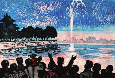 聚焦觀賞煙花,“新興木刻運(yùn)動(dòng)”先驅(qū)之一的李樺也曾留下作品,那是以套色版畫(huà)形式創(chuàng)作的 《國(guó)慶之夜》。遠(yuǎn)處,一簇簇?zé)熁饹_上云霄,如花瓣般繽紛四落;近處,是觀賞的人們一字排開(kāi)的背影,其中一位張開(kāi)雙臂的男子與一個(gè)坐在大人肩頭的孩童都是點(diǎn)睛之筆。人群與煙花之間,隔著波光粼粼的湖水,最是讓這幅畫(huà)從一眾描繪國(guó)慶觀賞煙花的美術(shù)作品中脫穎而出,只見(jiàn)寧?kù)o與祥和從一派熱鬧的氛圍中透出。