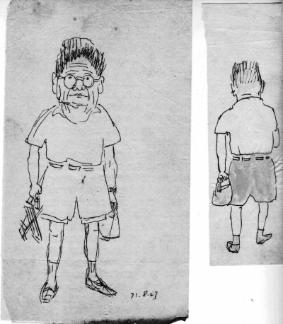 轉(zhuǎn)眼到了今年9月末,我請孔夫子網(wǎng)的同志來收舊書。我父親的外文書和中文書都分別捐給了社科院和現(xiàn)代文學(xué)館,還剩下一些馬列著作沒拿走??粗@幾箱書我犯愁,難道就當(dāng)廢品處理嗎,我不忍??追蜃泳W(wǎng)的劉杰來看過,她認(rèn)為大部分他們可以收走。我如釋重負(fù),為這些書籍能繼續(xù)發(fā)揮作用而高興。就在他們整理圖書做書目時,意想不到的事發(fā)生了:在父親的一本舊書里,發(fā)現(xiàn)了高莽先生的兩幅舊作。那是在干校時高莽先生畫我父親的速寫,一幅畫正面,另一幅是背影。