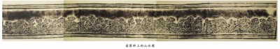 山谷,溪水沿谷底而流。左上方,有一亭式建筑倚立于左三山的山坳之前。右山腳下的溪水邊,停泊著一小木舟,景象異常恬靜。第三個空間,則是第二個空間左三山向左的延續(xù),在畫面最左面的山坳間,亦有兩座茅屋隱現(xiàn)。有的茅屋頂上挑著一面小旗,是為酒肆的標(biāo)志。從整個畫面看,近景是峰巒迭嶂,遠(yuǎn)景則是山勢連綿。樹木、溪流、小橋、木舟、茅屋、酒肆等點綴其間?!薄熬望u簿鐘飾紋帶所表現(xiàn)的山水題材來說,也具有北宋繪畫中山水長卷的時代特征?!?/p>