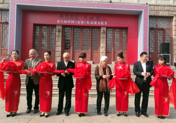 圖為中共高密市委書記楊建華(圖右一)、著名美術評論家邵大箴(圖左二)、著名畫家單應桂(圖右二)、著名畫家謝麟(圖左一)為第八屆中國(高密)紅高粱文化節(jié)紅高粱之約·丹青高密書畫展剪彩。