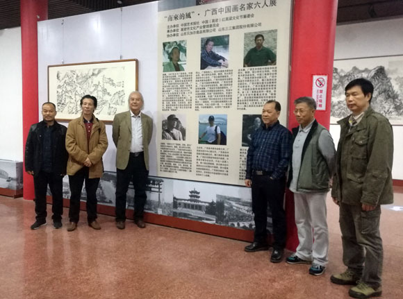 圖為廣西中國畫名家謝麟(左三)、陽山(左二)、余永?。ㄓ叶?、白曉軍(右三)、王慶軍(右一)、潘正華(左一)在紅高粱之約·丹青高密·南來的風畫展現(xiàn)場合影。