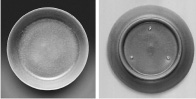 汝窯瓷的制作極為講究,大多為“滿釉支燒”,也有墊燒的器物。盤、碗、洗等器物采用“滿釉支燒”,支釘?shù)暮圹E細小如芝麻狀,俗稱“芝麻釘”,常見三枚或五枚的支釘痕。橢圓形盆多為六枚支釘,支釘緊靠圈足,斷面呈白色,亦有個別支釘痕為不規(guī)則的小圓形。瓶、罐等大多采用墊餅與墊圈燒造,器物的圈足底部均施釉,圈足端無釉。汝窯的支釘支燒工藝,是模仿了南方越窯的支燒技術,同時吸收了河南魯山窯(窯址位于河南省魯山縣)、鞏縣窯(窯址位于河南省鞏義市)等北方窯場的支釘技術,并且把南方越窯的支燒技術發(fā)展到了極致,支燒點也逐漸由足端向內(nèi)移,從而使得器物在燒造時更加穩(wěn)定。
