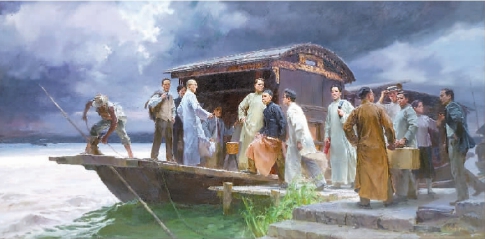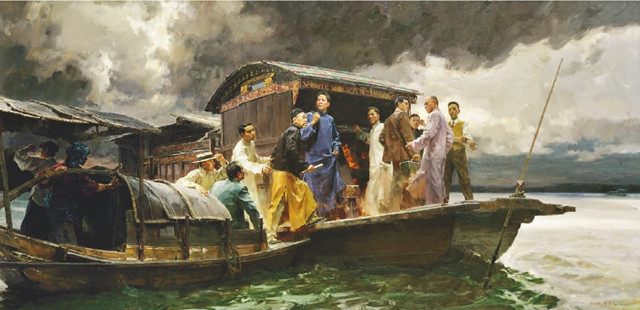 在我心中兩張稿子都是難以割舍的。在整個(gè)構(gòu)思的過(guò)程中,我反復(fù)查閱了大量有關(guān)一大的資料,其中一大代表的生平深深地觸動(dòng)了自己,深感一大代表身上都流淌著要改變舊中國(guó)的一腔熱血。他們當(dāng)時(shí)是一群年輕的、自覺(jué)的、渴望肩負(fù)國(guó)家及民族命運(yùn)的知識(shí)分子,暫且不說(shuō)其中某些人的歷史命運(yùn)發(fā)生了何種變化,我的內(nèi)心很希望能將參加南湖會(huì)議的全部代表都在畫(huà)中有所表現(xiàn)。所以,我在畫(huà)稿中盡量想安排好每個(gè)代表出場(chǎng)位置。根據(jù)李達(dá)夫人王會(huì)悟的回憶,南湖紅船并不能直接停靠煙雨樓前的碼頭,而是停在湖中,由一只小船(稱拖捎船)往來(lái)于碼頭與大船之間接送客人。如果表現(xiàn)這樣方式上船,很難表達(dá)出我想將一大代表全部畫(huà)進(jìn)去的初衷,于是我設(shè)想一大代表由碼頭邊的跳板上船,這樣的安排可以將一大代表較為輕松地安排在畫(huà)面中。而且這樣畫(huà)面容易體現(xiàn)出會(huì)議的莊重,然后我盡量加重畫(huà)面的色調(diào),強(qiáng)化了風(fēng)雨前的效果,將光線斷斷續(xù)續(xù)地集中在代表身上,使畫(huà)面的神秘感有所加強(qiáng),也使較多的人物在空間展開(kāi)時(shí)有主次之分。這張構(gòu)圖在人物表現(xiàn)的主次關(guān)系中,側(cè)重于2002年中共黨史新編中的排序,突出了李達(dá)、李漢俊、陳潭秋和董必武的地位,青年毛澤東則緊隨其后。后來(lái),在我的合作者黃發(fā)祥老師的協(xié)助下,歷時(shí)七個(gè)月的緊張工作,完成了這張5米長(zhǎng)、 2 . 5米高的創(chuàng)作。作品完成后的效果基本達(dá)到了預(yù)期要求。