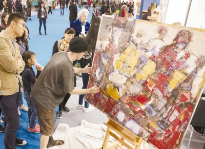 圖為藝術家在藝博會上一邊作畫一邊為觀眾講解。 佳 碩攝(人民視覺)