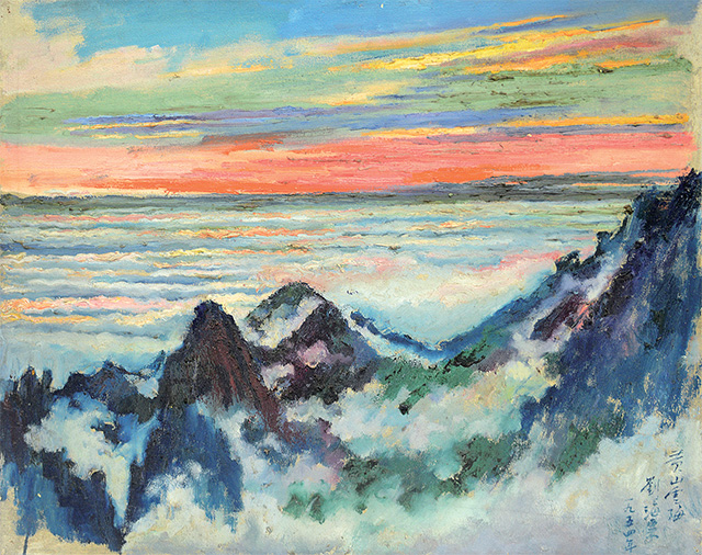 展覽開幕式上,劉海粟子女將劉海粟創(chuàng)作的油畫《黃山云?!贰⒅袊嫛稘M庭芳(潑墨黃山)》、書法《畢竟西郊八月中》捐贈(zèng)給中國美術(shù)館。展覽將持續(xù)至11月26日。圖為劉海粟1954年創(chuàng)作的作品《黃山云?!?。 (欣 聞)
