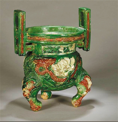 其中一款名為《琉璃三彩龍穿花直耳爐》的爐具吸引了眾多市民圍觀。此爐高28.5厘米、口徑為18厘米、底足12.5厘米,為琉璃三彩制器,以綠釉為底色,間施紅、白色釉分別裝飾龍紋與牡丹紋。頸部刻有香草紋,腹部使用浮雕技藝來表現(xiàn)飛龍游戲與盛開的牡丹之間,底部則由三條獅首足盛托爐身,顯得頗為有氣勢。據(jù)閻焰介紹,此爐為明代制品,大約為公元1368年~1644年間制造,至今約450年歷史?!斑@是一場用沉香點燃的文化穿越之旅?!遍愌嬲f。