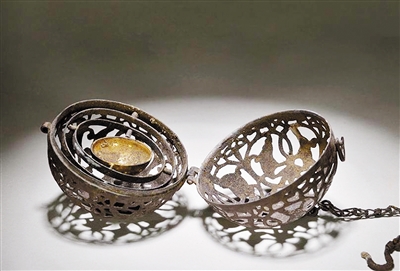 另有一款唐代《鎏金碗銀鏤空香熏》為銀質,呈圓球形,通體鏤空。無論外壁球體如何轉動,由于機環(huán)和銀盂的重力作用,香盂始終保持重心向下,里面盛放的沉香不致撒落。閻焰介紹說,這一原理類似今日航空和精密機械常用的水平陀螺儀。同類香囊法門寺、何家村均有出土,為唐時貴族用器。