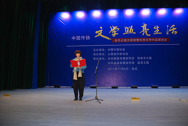 在隨后舉行的優(yōu)秀文學(xué)作品誦讀會(huì)上,山西陽泉的作家和文學(xué)愛好者朗誦了葉廣芩的散文《景福閣的月》、張石山的散文《忠義藏山,高絕千古》、劉慈欣的科幻小說《流浪地球》、指尖的散文《燒樹葉》等作品節(jié)選。這些優(yōu)秀作品所散發(fā)出的光輝和情感真摯的誦讀引發(fā)了在場(chǎng)聽眾的強(qiáng)烈共鳴,獲得了陣陣熱烈掌聲。