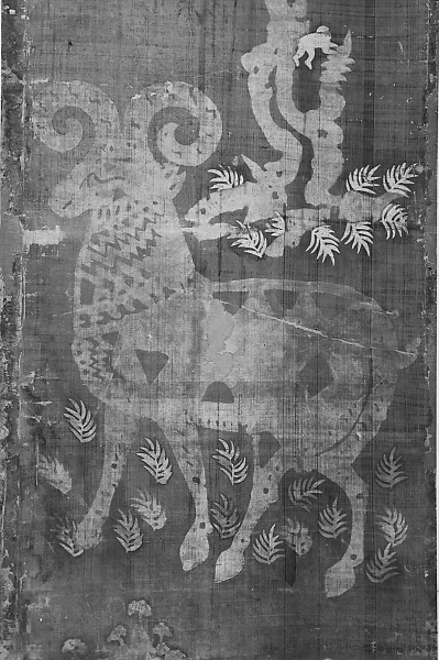 這個(gè)屏風(fēng)高1.63米,染成黃色后上蠟,然后再染紅色,這樣上蠟的部分就形成了圖案:一株大樹下站著一只卷角羊,羊身上有幾何形圖案。這個(gè)屏風(fēng)不光工藝精美,更是古代絲綢之路交流的重要例證。根據(jù)屏風(fēng)上的墨書記錄,這個(gè)屏風(fēng)是751年之后在日本制作的,然而上面的卷角羊原產(chǎn)于伊朗,當(dāng)時(shí)的日本人是不可能見到的,那這個(gè)屏風(fēng)是怎么設(shè)計(jì)的呢?很顯然,中間的關(guān)鍵環(huán)節(jié)就是中國唐朝。