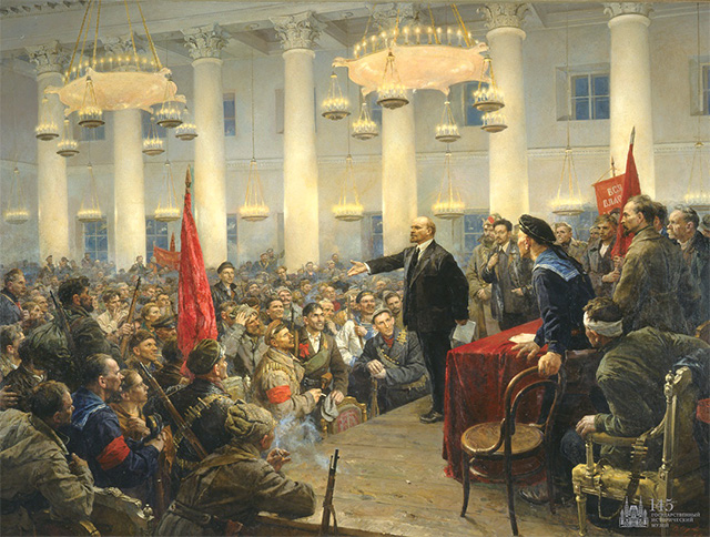第一部分“偉大的革命”,展示了“阿芙樂爾”號巡洋艦舷窗、“十月革命萬歲”旗幟等珍貴文物和20余張描繪十月革命等重大事件的油畫作品,包括勃羅茨基的《1917年5月列寧在普基洛夫工廠工人大會演講》、謝洛夫的《列寧在全俄蘇維埃第二次代表大會上講話》、格拉西莫夫的《列寧在講壇上》、索科洛夫-斯卡利亞創(chuàng)作的《向冬宮突擊》等經(jīng)典歷史題材繪畫作品。此外,本部分還展出了一系列照片和明信片,它們可謂1917年2月至10月彼得格勒和莫斯科這兩個俄羅斯主要城市的一份獨特的大事記。
