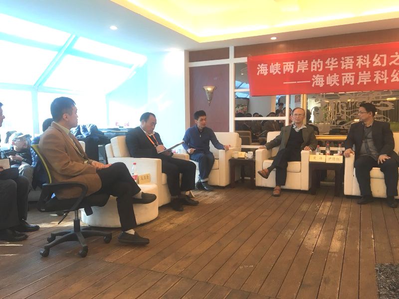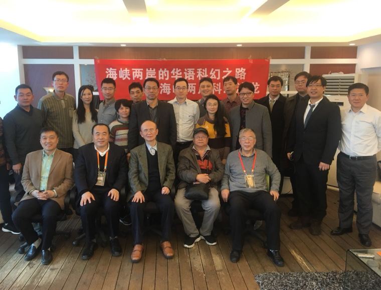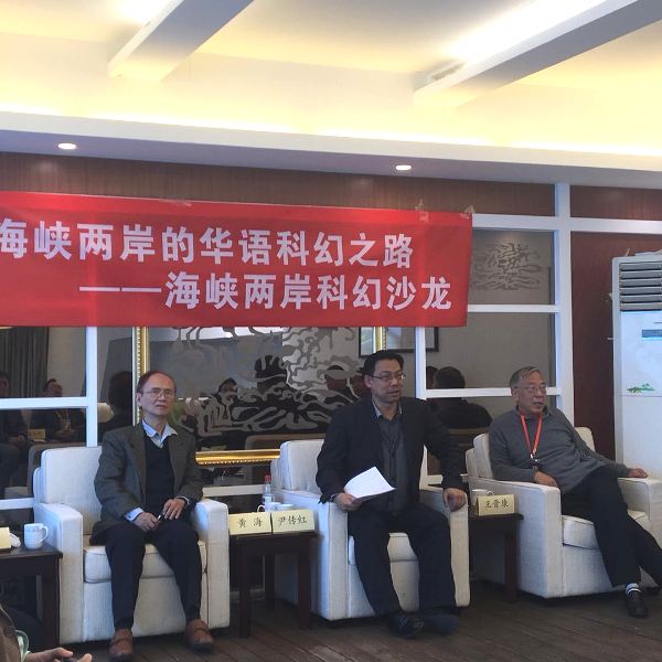 2017年11月18日上午,在北京嘉華世紀(jì)鳳皇社舉辦了“海峽兩岸的華語科幻之路”沙龍,該活動為“繁榮科普創(chuàng)作,助力創(chuàng)新發(fā)展”系列沙龍第十一期,由中國科普作家協(xié)會主辦,成都時光幻象公司(中國科普作家協(xié)會單位會員)承辦,疆君編劇工作室協(xié)辦。來自臺灣地區(qū)的以著名科幻作家黃海為首,有林健群、李知昂、林天中(石林散人)、陳厚岐(歐若奇)等科幻作家、學(xué)者,與大陸當(dāng)代科幻界領(lǐng)軍人物劉慈欣、吳巖、王晉康、韓松、董仁威、姚海軍、何夕、陳楸帆、江波、吳顯奎等進(jìn)行了對話。海內(nèi)外著名科幻作家、科幻理論家、翻譯家、出版人劉宇昆、三豐、顧備、胡紹晏、趙曉旭、楊楓等也參加了交流。