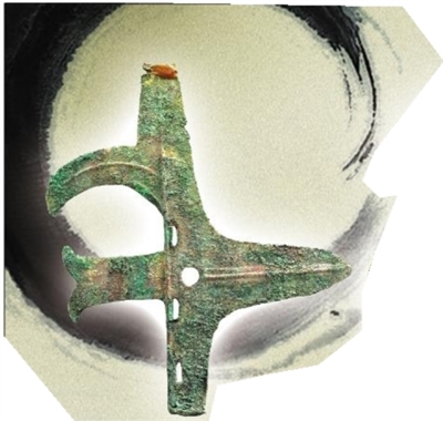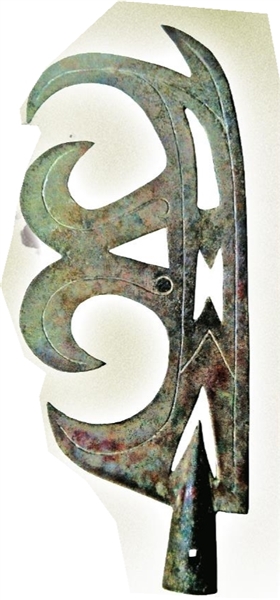 這件鉤戟長37.7厘米,寬15.2厘米。尖端分叉,上鋒較長,下鋒較短,器身有三處鏤孔,形狀均不太規(guī)則。背部有左右相反的彎鉤形裝飾,下有短銎,銎上有長方形穿孔。這種形狀的鉤戟非常罕見,寶雞竹園溝西周墓地曾出土一件亦有類似的鉤形裝飾(圖二),但區(qū)別還是很大的。結(jié)合這兩處墓地的年代,這件鉤戟應(yīng)為西周早期的兵器。此器造型奇特,裝飾風(fēng)格繁瑣夸張,鮮有與之相同者。陳昭容研究員認為應(yīng)該不是實用器,推測或為儀仗之用。這是戴家灣墓地出土的最有特點的兵器,為研究其文化來源提供了重要線索??紤]到它與竹園溝出土的青銅戟有相似之處,不排除兩者曾受到相同文化之影響。